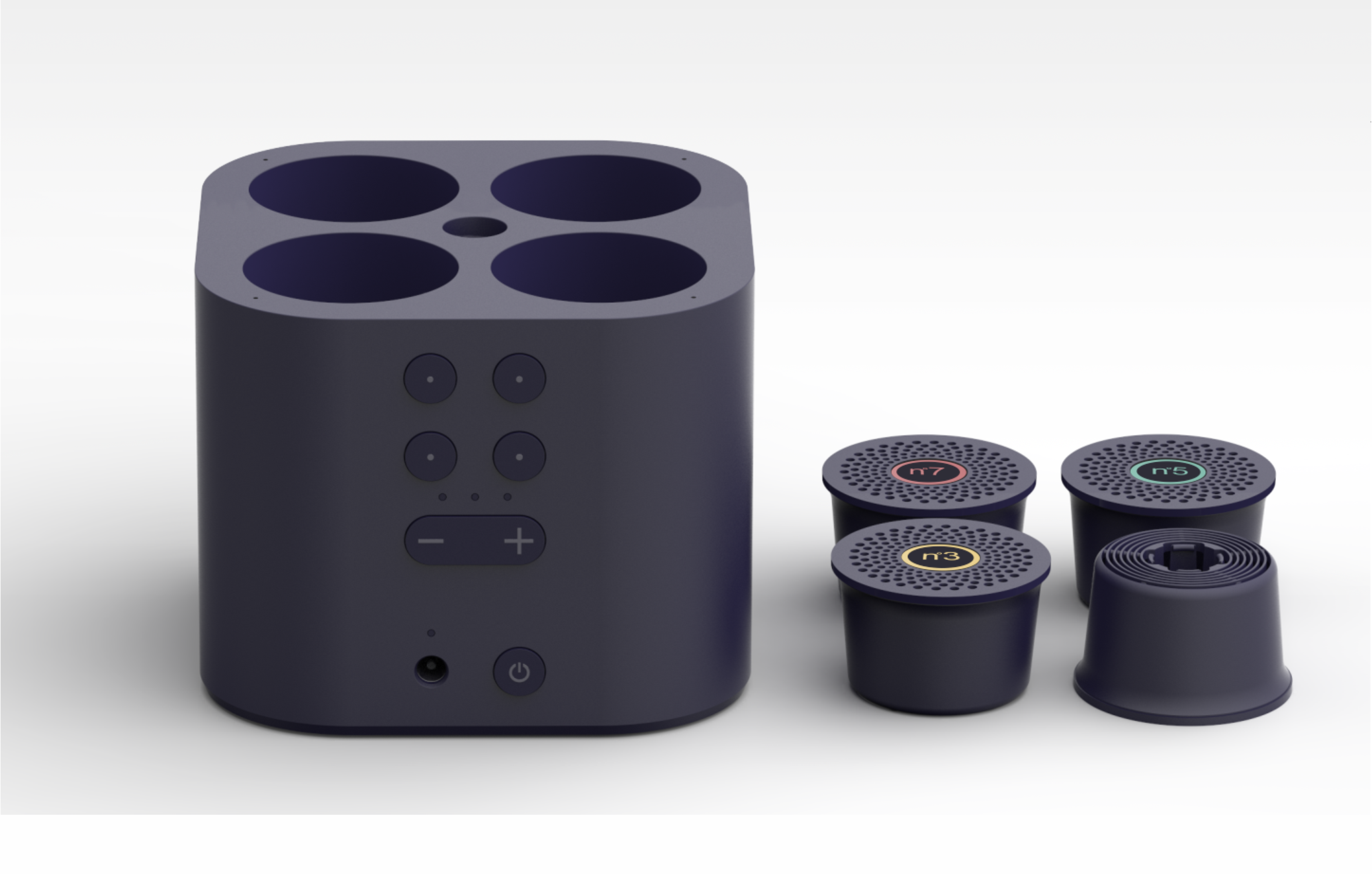 Moodo approached Trim to develop a long-view strategy and its first fragrance device. We saw this as a great challenge and opportunity to create a different experience from what exists in the fragrance diffuser Market. After brainstorming with Moodo team, we came out with the idea to give the user the possibility to create their own fragrance by mixing different basic ones. This created a new concept of home fragrance devices by giving the user a playful experience to customize ambience fragrances easily. After having the basic concept idea, we explored different compositions to find the right balance between quantity of basic fragrances and form factor of the device. The four capsules iconic configuration for the device gave the perfect solution for the branding development, logo, capsules packaging, mobile App.