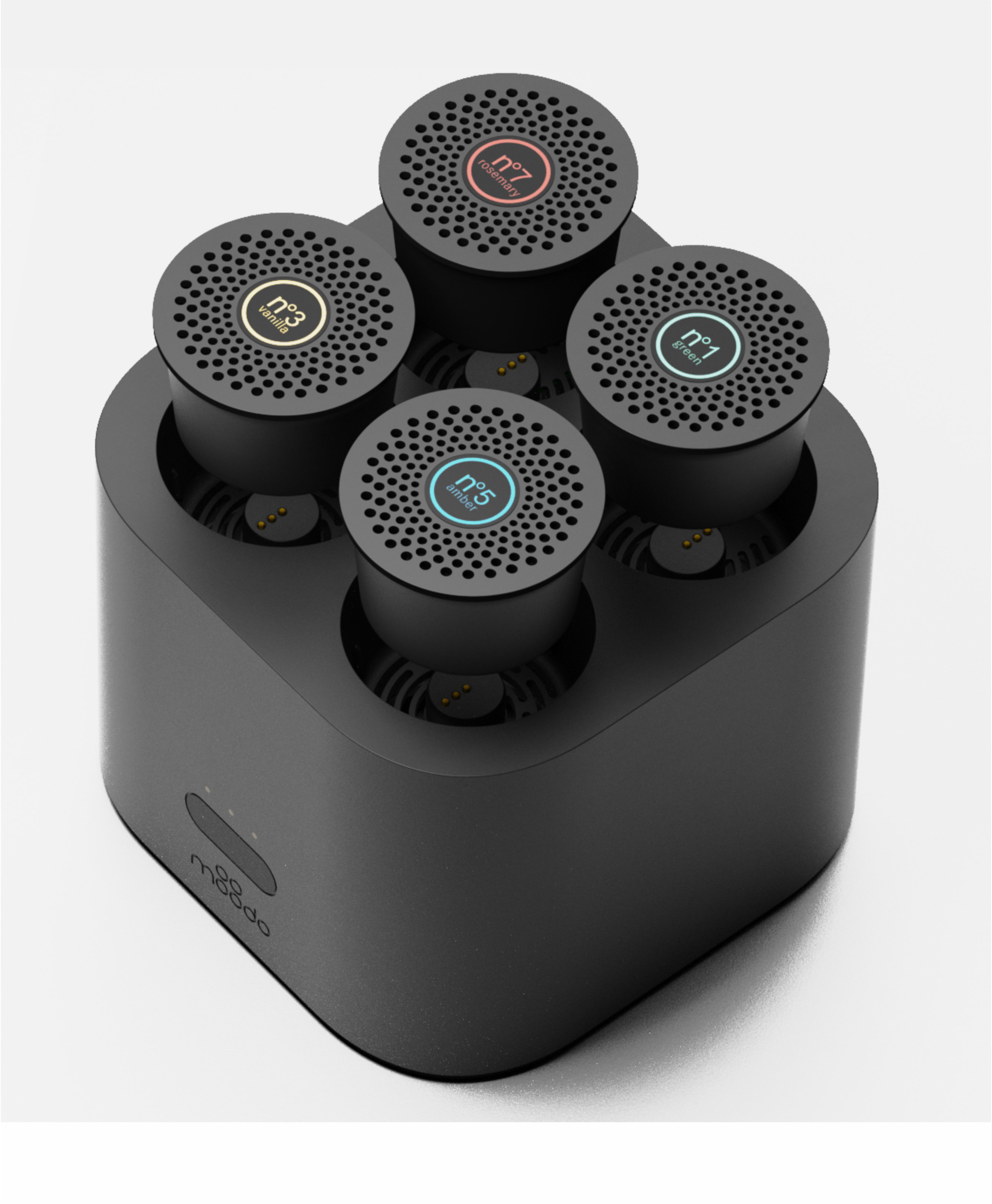 Composition, proportions and details gave to this device a simple yet sophisticated look. We integrated all necesary mechanical requirements in the main part, giving a feel of one solid body. We took all unnecessary things away, and left only the essential. the design of the capsule was based on multiple technical parameters: Air flow, attachment to the device, easy assembly and cost. In order to make the system smart, we developed for Moodo, a simple yet sophisticated label that allows the device to recognize multiple fragrances that are in use.